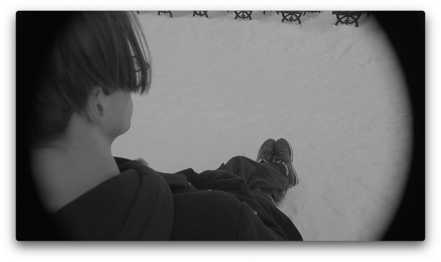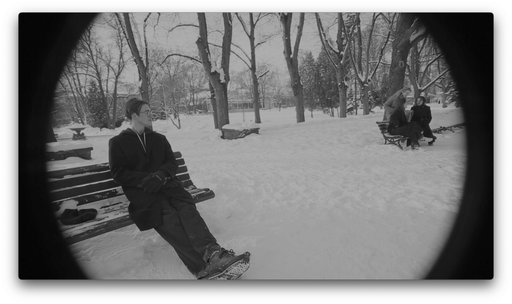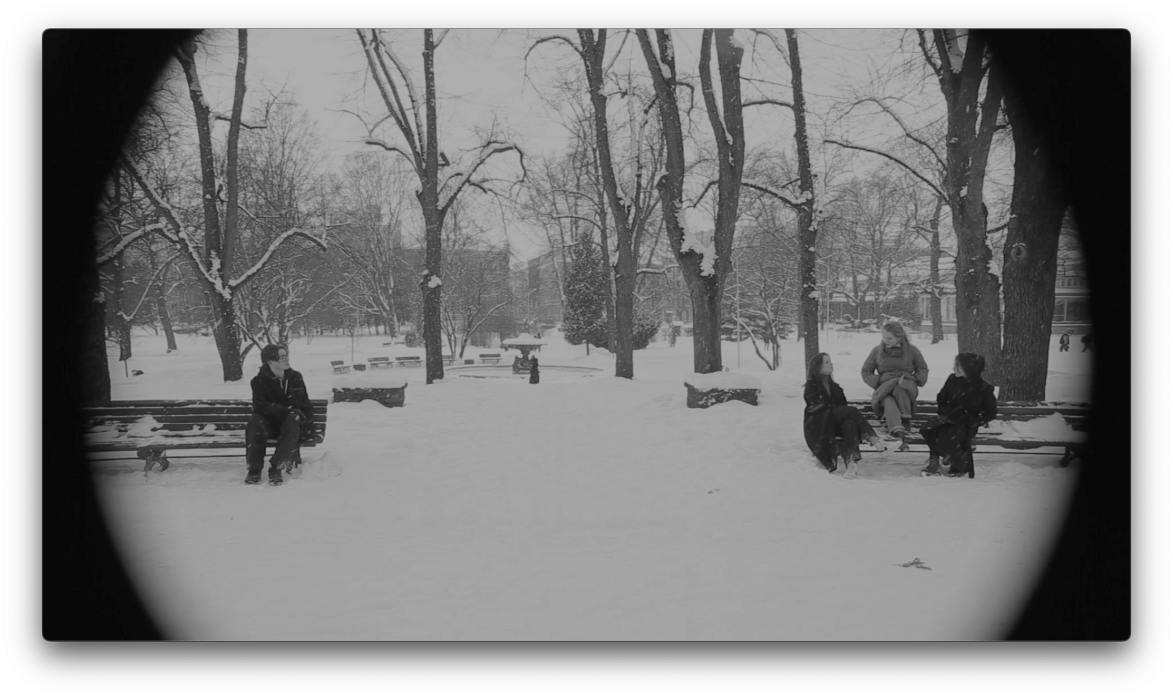 The black-and-white palette adds a timeless, nostalgic feel, while the soft, blurred edges create a sense of quiet observation. The snowy setting enhances the mood of fleeting emotions and isolation, perfectly complementing the film’s theme of brief, unspoken connections.